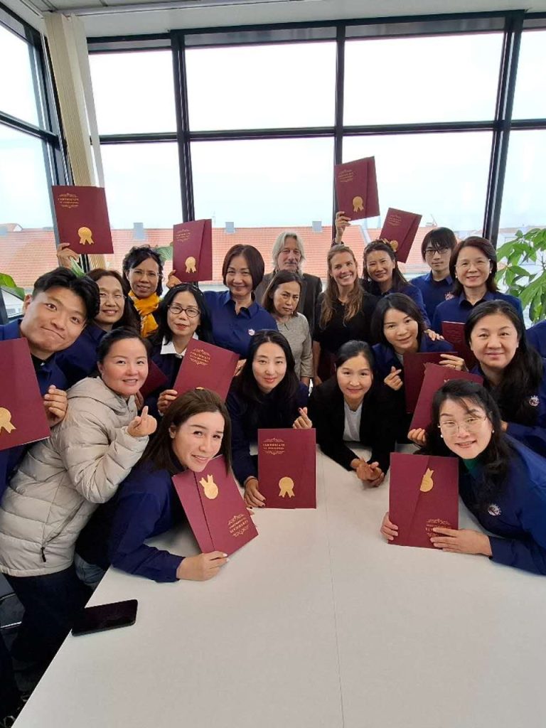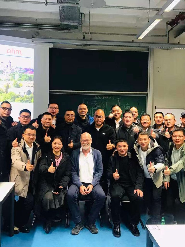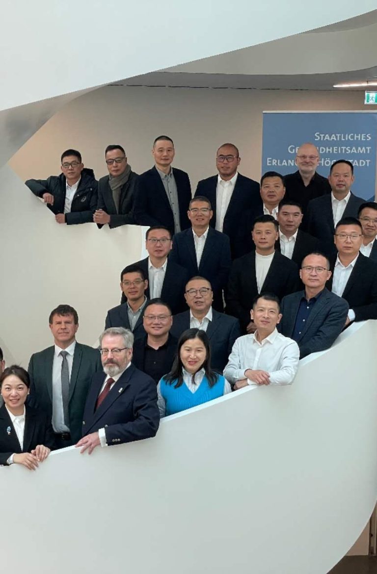 „Dr. Neumann vom staatlichen Gesundheitsamt empfängt die Delegation chinesischer Schulen und präsentiert die bestehenden Hygienekontrollmaßnahmen.“